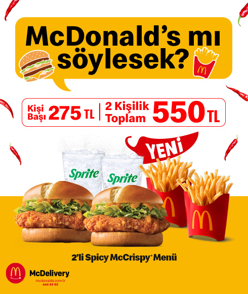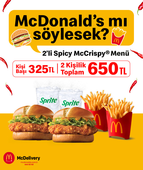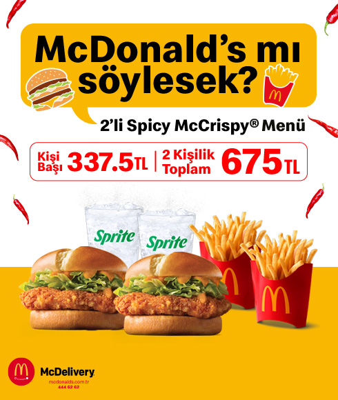 Görseller temsili olup ürünlerin sunum, fiyat ve servis şekilleri restoranlara göre farklılık gösterebilir. Servis takımı sunuma dahil değildir.2 adet Spicy McCrispy, 2 Adet Orta Patates ve 2 Adet Orta İçecek’ten oluşan 2’li Spicy McCrispy Menü’nün fiyatı 550-TL’dir. Menüde yer alan içecek ve patates, ek ücret karşılığında büyük veya süper boy olarak tercih edilebilir. Görselde yer alan fiyatlar, yalnızca katılım sağlayan restoranlardan McDonald’s sipariş kanalları aracılığıyla verilecek paket servis siparişlerde geçerlidir. Kampanya, Gel-Al siparişlerinde ve havalimanı restoranlarında geçerli değildir.İçecek seçimlerinde ayran ek ücrete tabidir. Fiyatlara KDV dahildir.McDonald’s’ın önceden haber vermeksizin kampanyada/fiyatlarda değişiklik yapma ve kampanyaları durdurma hakkı saklıdır.McDonald's International Property Company Ltd., McDonald’s® markaları ve ambleminin tek hak sahibidir. “Sprite”, The Coca-Cola Company’nin tescilli markasıdır. Sağlığınız için aşırı şeker, yağ ve tuz tüketimini azaltınız.