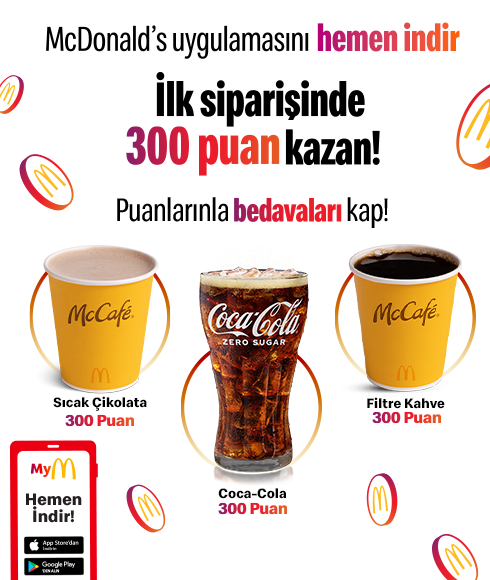 - Kampanya kapsamında, McDonald’s uygulamasına ilk kez kaydolan kullanıcıların hesaplarına, uygulamayı kullanarak verecekleri ilk siparişin arından 300 puan tanımlanacaktır. İlgili 300 puan karşılığında Küçük Boy Sıcak Çikolata, Küçük Boy Filtre Kahve veya Küçük Boy Coca-Cola ürünlerinden biri satın alınabilecektir.