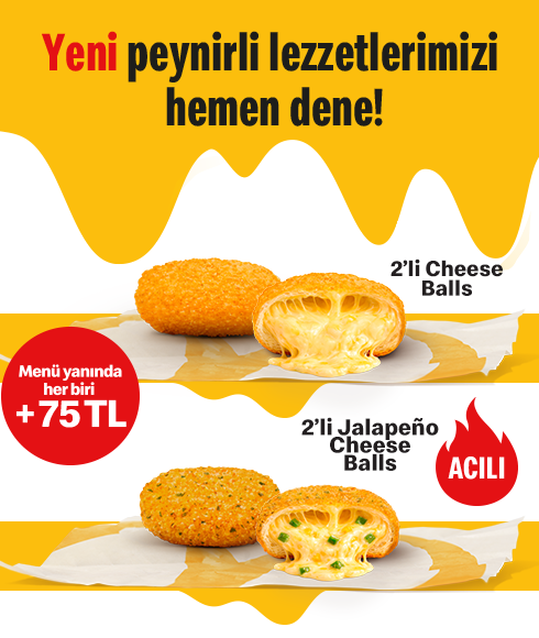 Görseller reklam amaçlı olup ürünlerin sunum, fiyat ve servis şekilleri restoranlara göre farklılık gösterebilir. Kampanya kapsamında, menü siparişlerinin yanında 2’li Cheese Balls veya 2’li Jalapeño Cheese Balls, 75-TL karşılığında satışa sunulmaktadır.