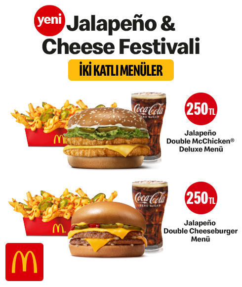 Görseller temsilidir. Görselde belirtilen fiyatlar seçili restoranlarda geçerli olup fiyatlar, ürünlerin sunum ve servis şekilleri restoranlara göre değişiklik gösterebilir. Menüler; 1 adet burger, 1 adet orta boy McFlavor Fries Jalapeno & Cheese ve 1 adet orta boy içecek ile servis edilir. Happy Meal ve küçük boy menü haricindeki menü siparişleri için içecek şeçimlerinde ayran ek ücrete tabidir. Menü yanında ayran seçilmesi halinde; Küçük Boy, Orta boy ve Büyük boy menülerin yanında 1 adet, Süper boy menülerin yanında 2 adet ayran servis edilir. Kampanya, havaalanı restoranlarında ve restoran dışı siparişlerde geçerli değildir.Görsellerde yer alan ürünler seçili restoranlarda satışa sunulmakta olup ürünler, restoranların çeşitli şubelerinde geçici olarak temin edilemeyebilir. McDonald’s’ın dilediği zaman önceden haber vermeksizin ürün satışını sona erdirme ve/veya fiyatları değiştirme hakkı saklıdır. Fiyatlara KDV dahildir. McDonald's International Property Company Ltd., McDonald’s ve McCafé markaları ve ambleminin tek hak sahibidir. “Coca-Cola”, “Coke”, “Coca-Cola Zero”, “Coke Zero”, dinamik kuşak ve kontur şişe The Coca-Cola Company’nin tescilli markalarıdır. Sağlığınız için aşırı şeker, yağ ve tuz tüketimini azaltınız.