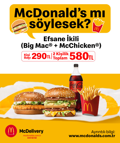 - Kampanya, yalnızca katılım sağlayan restoranlardan McDonald’s sipariş kanalları aracılığıyla verilecek paket servis siparişlerde geçerlidir. Menü, 1 adet Big Mac ® sandviç, 1 adet McChicken ® sandviç, Orta Boy Patates, 1 L içecek’ten oluşmaktadır. Kampanya kapsamındaki menü siparişleri için içecek şeçimlerinde ayran ek ücrete tabidir .McDonald’s’ın önceden haber vermeksizin fiyatlarda değişiklik yapma, kampanyayı dilediği zaman sonlandırma ve/veya kampanya sürecini değiştirme hakkı saklıdır. Sunum, fiyat ve kampanyalar restorana göre farklılık gösterebilir. Görseller temsilidir, servis takımı sunuma dahil değildir. Başka bir kampanya ile birleştirilemez. ‘’Coca-Cola”, “Coke”, “Coca-Cola Zero”, “Coke Zero”, dinamik kuşak ve kontur şişe The Coca-Cola Company’nin tescilli markalarıdır.