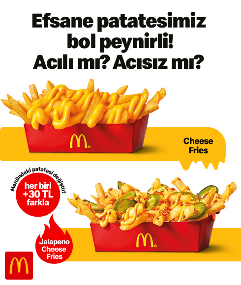 Görseller reklam amaçlı olup ürünlerin sunum, fiyat ve servis şekilleri restoranlara göre farklılık gösterebilir. Görselde yer alan ürünler seçili restoranlarda satışa sunulmaktadır. Ürünler, restoranın çeşitli şubelerinde geçici olarak temin edilemeyebilir. Ürünlerin küçük boy satışı bulunmamaktadır. McDonald’s’ın dilediği zaman önceden haber vermeksizin ürün satışını sona erdirme ve/veya fiyatları değiştirme hakkı saklıdır. McDonald's International Property Company Ltd., McDonald’s ve McCafé markaları ve ambleminin tek hak sahibidir. Fiyatlara KDV dahildir. Sağlığınız için aşırı şeker, yağ ve tuz tüketimini azaltınız.