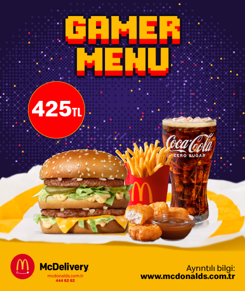 Kampanya, yalnızca katılım sağlayan restoranlardan McDonald’s sipariş kanalları aracılığıyla verilecek paket servis siparişlerde geçerlidir. Menü, Big Mac® + 4 Parça Chicken McNuggets® + Orta Boy Patates + Orta Boy içecek’ten oluşmaktadır. Kampanya kapsamındaki menü siparişleri için içecek şeçimlerinde ayran ek ücrete tabidir .McDonald’s’ın önceden haber vermeksizin fiyatlarda değişiklik yapma, kampanyayı dilediği zaman sonlandırma ve/veya kampanya sürecini değiştirme hakkı saklıdır. Sunum, fiyat ve kampanyalar restorana göre farklılık gösterebilir. Görseller temsilidir, servis takımı sunuma dahil değildir. Başka bir kampanya ile birleştirilemez. ‘’Coca-Cola”, “Coke”, “Coca-Cola Zero”, “Coke Zero”, dinamik kuşak ve kontur şişe The Coca-Cola Company’nin tescilli markalarıdır. Sağlığınız için aşırı şeker, yağ ve tuz tüketimini azaltınız