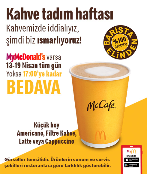 - Kampanya kapsamında, 13.04.2026 –19.04.2026 tarihleri arasında 07:00 - 17:00 saatleri arasında verilecek restoran içi siparişlerde bir adet küçük boy americano, küçük boy latte, küçük boy cappuccino veya küçük boy filtre kahve ücretsiz olarak servis edilir.