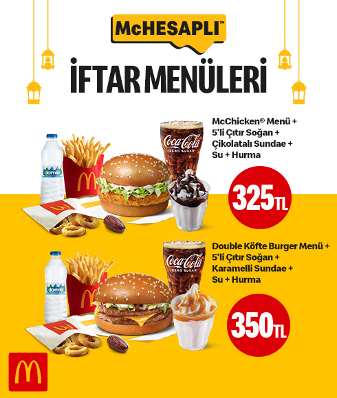 Kampanya 19.02.2026 – 19.03.2026 tarihleri arasında geçerli olup havaalanı restoranlarında ve eve siparişlerde geçerli değildir. Görseller temsili olup ürünlerin sunum, fiyat, kampanya ve servis şekilleri restoranlara göre farklılık gösterebilir. Görselde yer alan menü orta boy servis edilir. İçecek seçimlerinde ayran ek ücrete tabidir. Ürünler, restoranın çeşitli şubelerinde geçici olarak temin edilemeyebilir. McDonald’s’ın dilediği zaman önceden, haber vermeksizin ürünlerin satışını sona erdirme ve/veya fiyatları değiştirme hakkı saklıdır. Hurma ürünü stoklarla sınırlıdır. Fiyatlara KDV dahildir. “Coca-Cola Zero”, “Coke Zero”, dinamik kuşak ve kontur şişe The Coca-Cola Company’nin tescilli markalarıdır. Sağlığınız için aşırı şeker, yağ ve tuz tüketimini azaltınız.