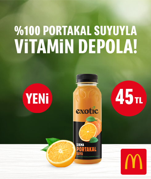 Görseller reklam amaçlı olup ürünlerin sunum, fiyat ve servis şekilleri restoranlara göre farklılık gösterebilir.Görselde yer alan fiyat, 1 (bir) adet 300 mL Exotic Sıkma Portakal Suyu ürünü ürünü için seçili McDonald’s restoranlarında verilecek restoran içi siparişlerde geçerlidir.Görselde belirtilen fiyatlara KDV dahildir.Ürünler, restoranın çeşitli şubelerinde geçici olarak temin edilemeyebilir.McDonald’s Türkiye’nin önceden haber vermeksizin fiyat ve/veya kampanyalarda değişiklik yapma ve/veya kampanyaları durdurma hakkı saklıdır. Sağlığınız için aşırı şeker, yağ ve tuz tüketimini azaltınız. Copyright© McDonald's International Property Company Ltd., McDonald’s markası ve ambleminin tek hak sahibidir. “Exotic” markası ile bu markayı havi “logo”, “etiket” ve “şişe” tasarımları Ge-Ta Tarım ve Gıda Sanayi Ticaret A.Ş.’nin tescilli marka ve tasarımlarıdır.