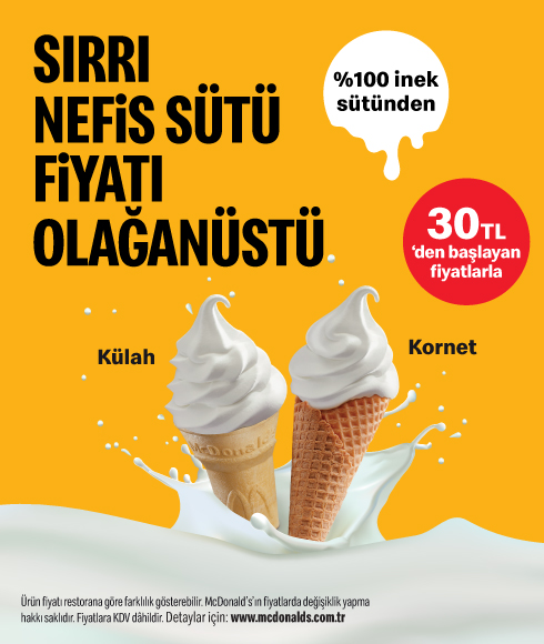 Fiyatlar seçili McDonald's restoranlarında ve restoran içi siparişlerde geçerlidir. Ürünler ilgili restoranın çeşitli şubelerinde geçici olarak temin edilemeyebilir. Görseller temsilidir. Ürünlerin sunum ve servis şekilleri farklılık gösterebilir. Sunum, fiyat ve kampanyalar restoranlara göre değişiklik gösterebilmektedir. Havalimanı restoranlarında ve eve siparişte geçerli değildir. McDonald’s’ın önceden haber vermeksizin fiyatlarda değişiklik yapma, kampanyayı dilediği zaman sonlandırma ve/veya kampanya sürecini değiştirme hakkı saklıdır. Copyright© McDonald's International Property Company Ltd., McDonald’s markası ve ambleminin tek hak sahibidir. Fiyatlara KDV dahildir. Sağlığınız için aşırı şeker, yağ ve tuz tüketimini azaltınız